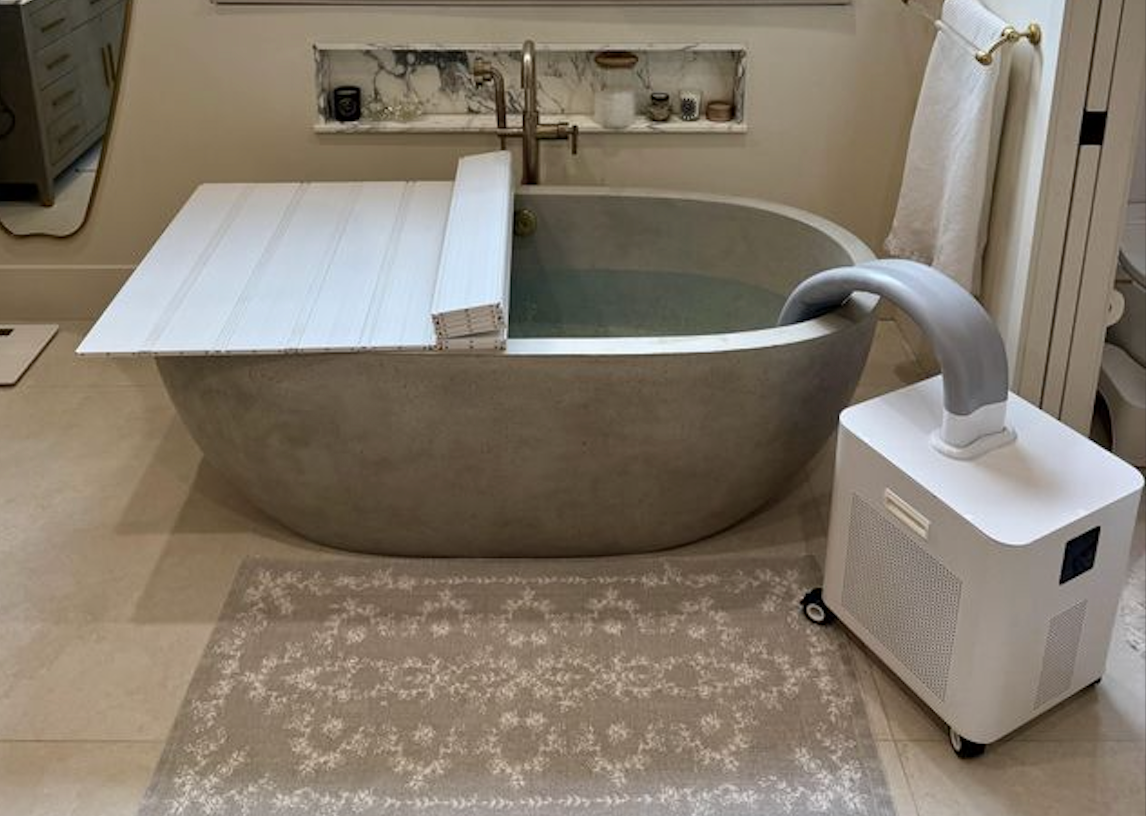 HomePlunge rolls up to the edge of your bathtub and the hose-arm dips into the water. The chiller's internal pump will draw the bath water out, chill it to your set temp, and cycle the chilled water back into the tub.